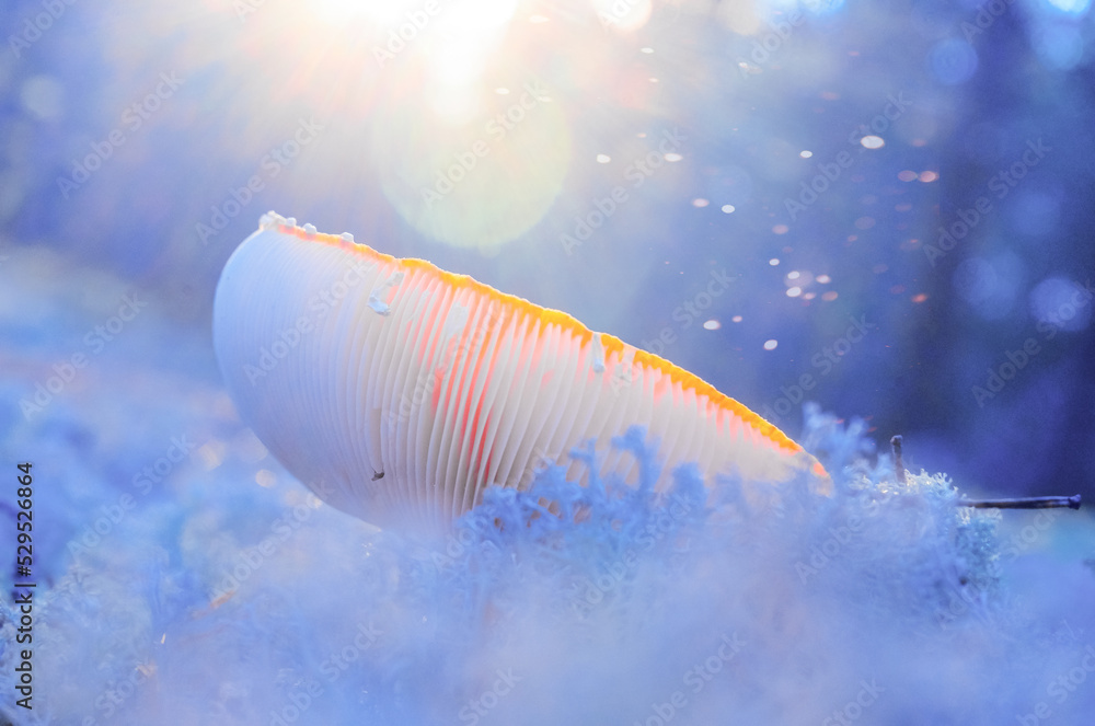 Fly agaric in forest with white moss with a fantasy blue light and fireflies