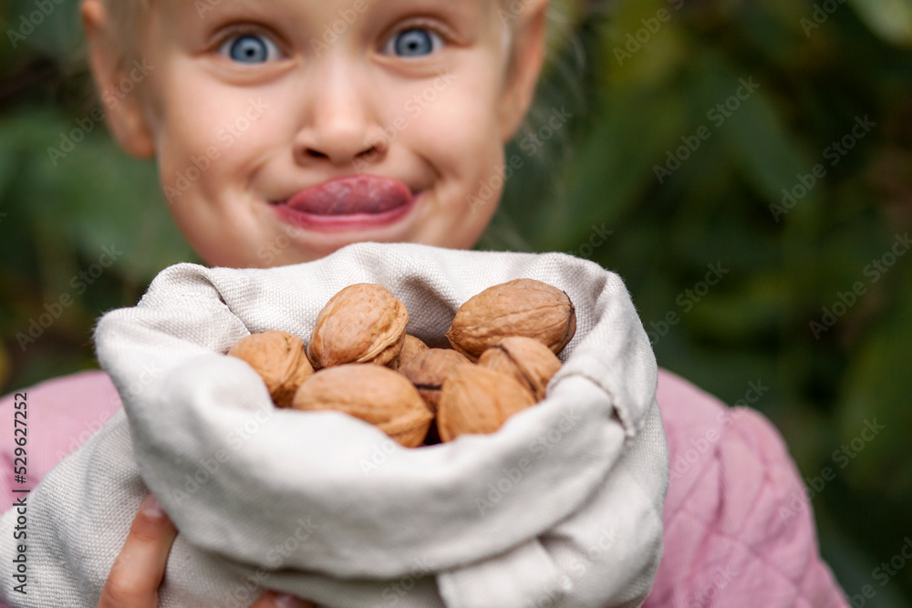 Walnut for Children. Walnuts in bag of Funny Cute Child. Walnut Nuts Harvest.