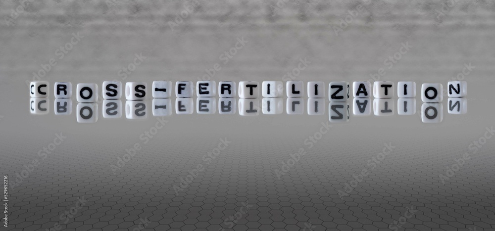 cross fertilization word or concept represented by black and white letter cubes on a grey horizon background stretching to infinity