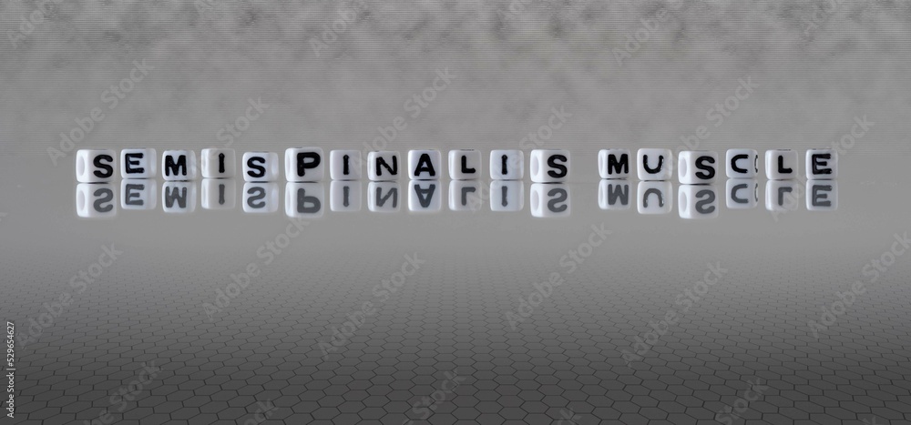 semispinalis muscle word or concept represented by black and white letter cubes on a grey horizon background stretching to infinity