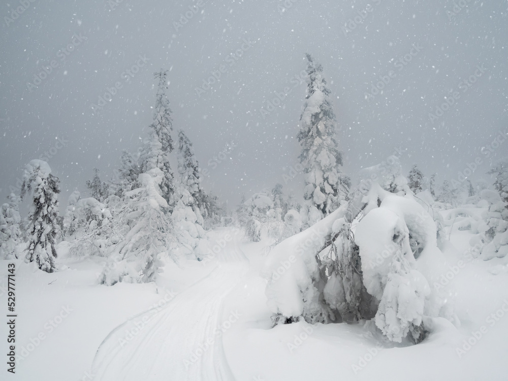 Dramatic winter minimalistic northern background with trail through trees plastered with snow against a snowy sky. Arctic harsh nature. Mystical fairy tale of the winter forest.