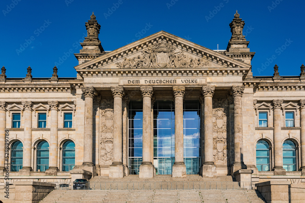 View of the distinctive Reichstag building from the Platz der Republik in Berlin, Germany