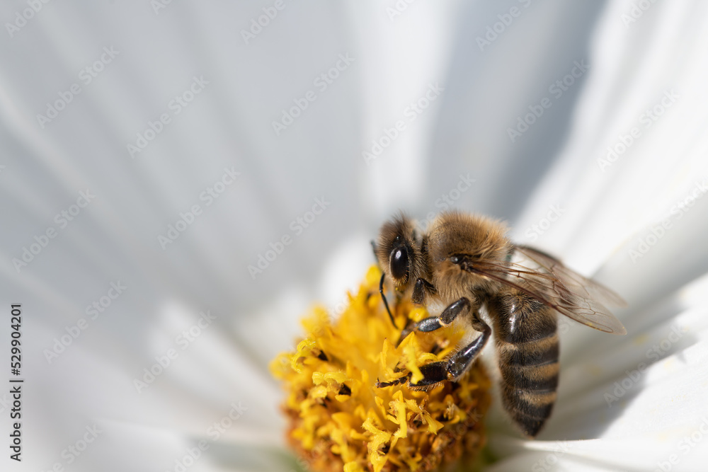 Close-up of a honey bee sitting on yellow pollen amidst a white flower. The bee is looking for food. The background is white.