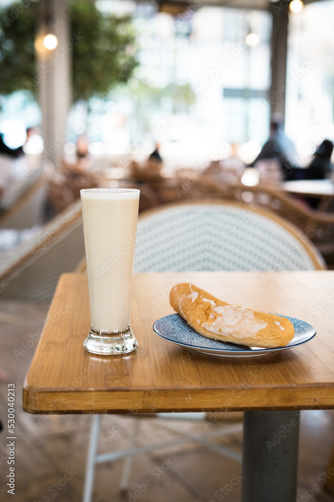 Horchata típica de valencia sombre una mesa y acompañada de un farton en vertical con fondo desenfocado.