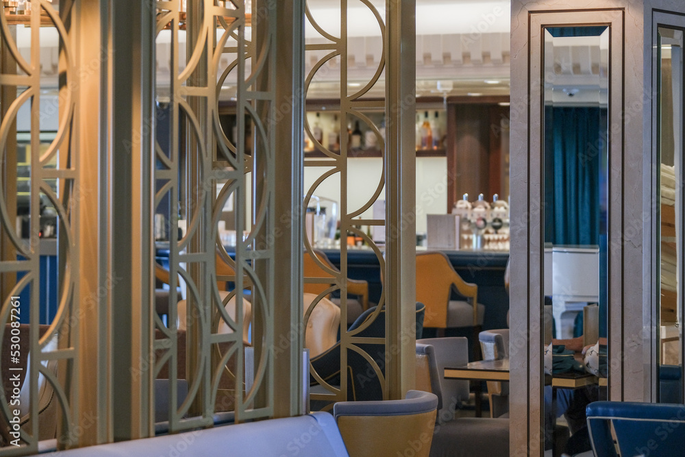 Elegant Art Deco interior design furnishing bar lounge area onboard ocean liner cruiseship cruise ship with chairs, tables, bar counter and brass room dividers