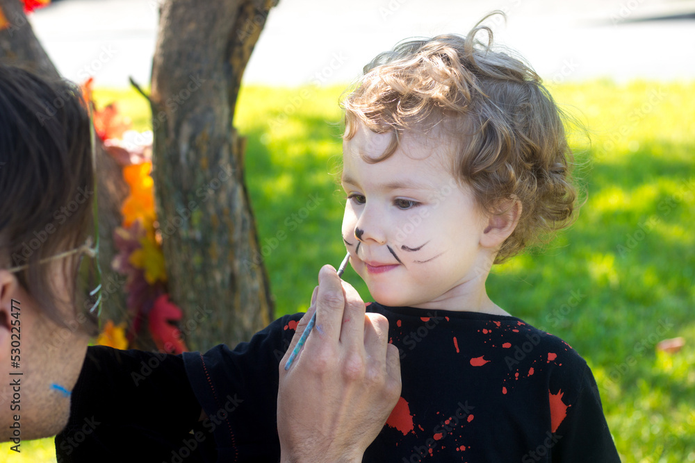 Dad painting on face of son with aqua paint. Halloween Face painting for party. Finishing costume with makeup