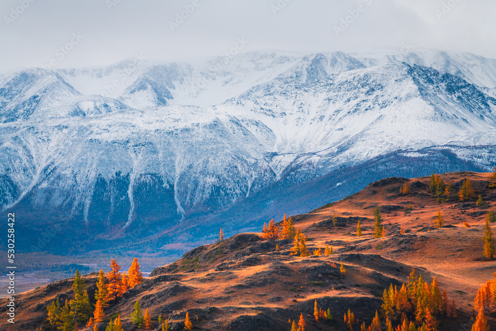 Snow-covered mountains and yellow autumn trees in Altai, Russia.