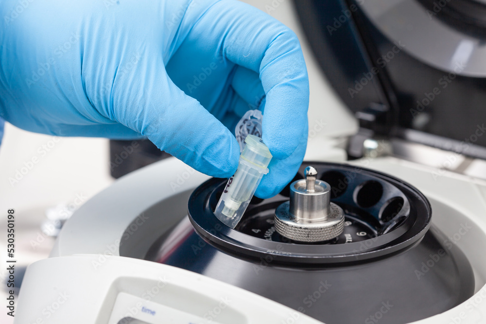 Closeup of a scientist hand placing a tube into an small table centrifuge. Spin column-based nucleic acid purification technique. Diagnosis of human papillomavirus virus infection.