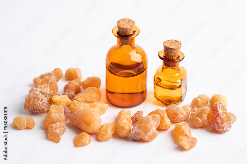Frankincense or olibanum aromatic resin isolated on white background used in incense and perfumes.