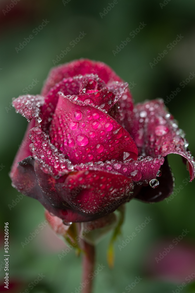 Close-up of a red rose covered in water drops. The rose is outdoors, in nature. The image is in portrait format.