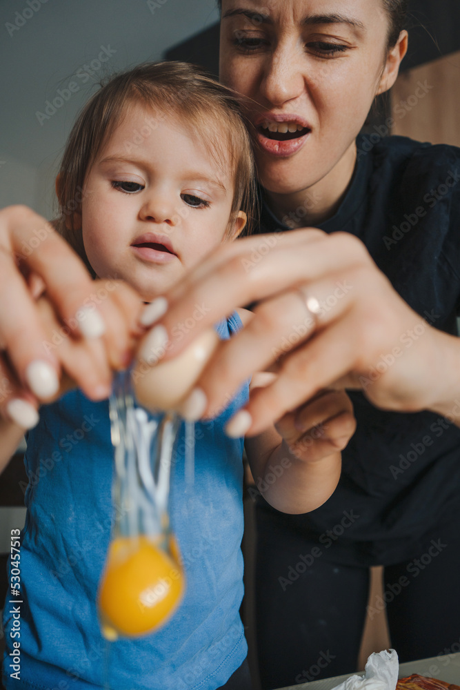 Caucasian mother teaching her baby daughter how to break eggs to make cakes. Smart girl learning to cook. Concept of friendly family cooks cakes