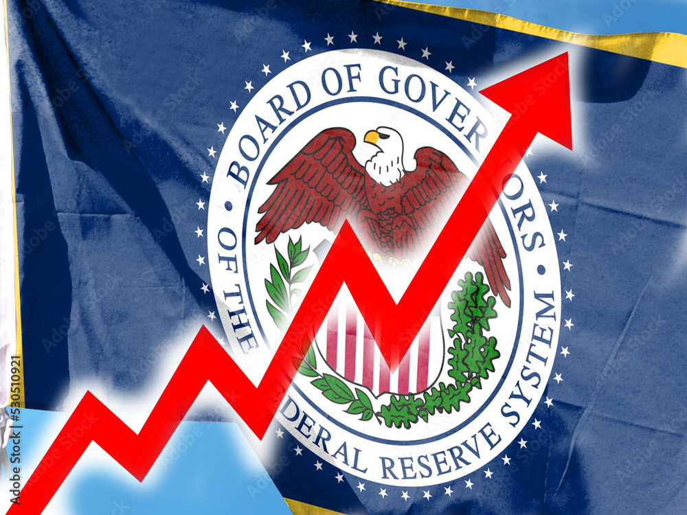 The U.S. Federal Reserve System, with a big red arrow above it. Bar charts and charts. Rising interest rates Rising interest rates, causing food prices to rise. Inflation concept