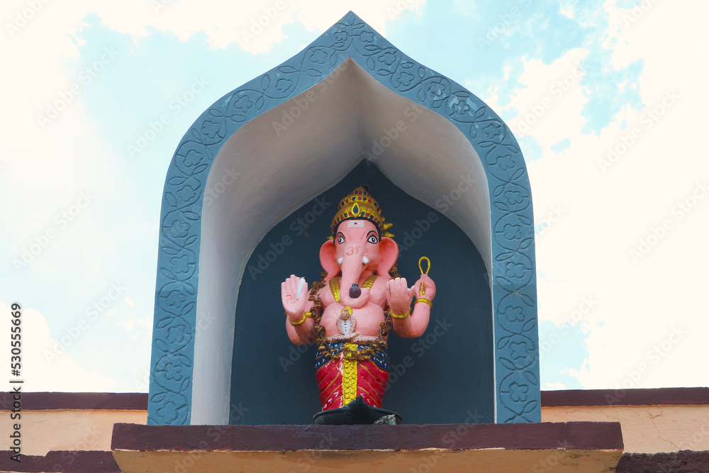 The Indian god Ganesha on the roof of the temple stands with a blessing gesture.