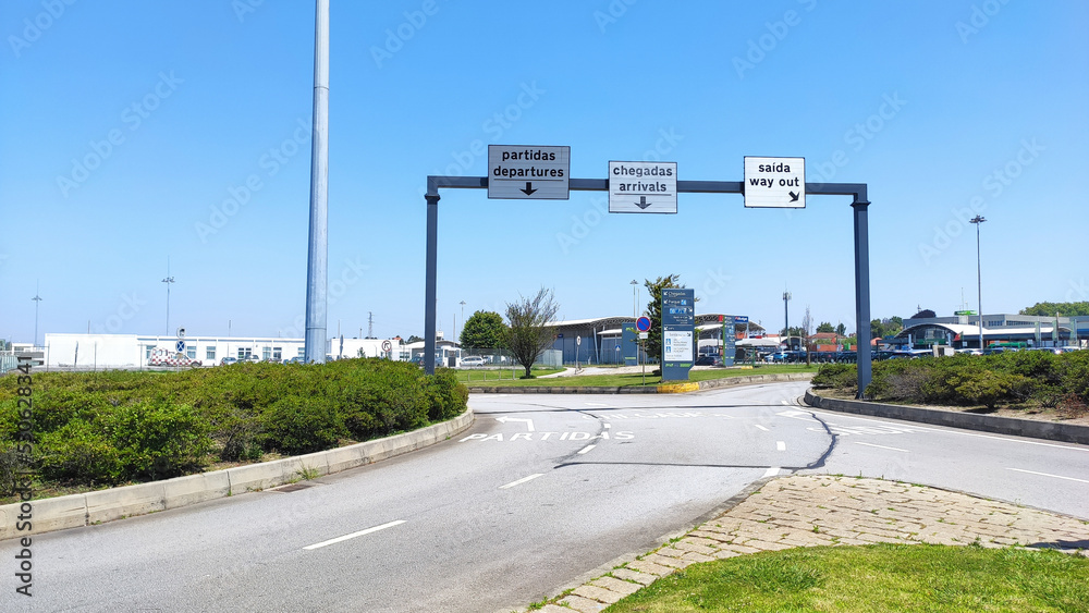 Porto, Portugal, July 17, 2021: Departures and Arrivals signages arriving at the Francisco Sa Carneiro Airport. International ANA Airport in Porto - OPO.