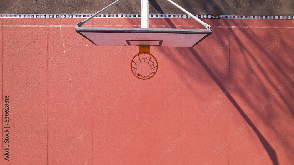 An iron outdoor basketball hoop with blue sky background in the sports field in Santo Tirso, Portugal. The basketball hoop or ring.