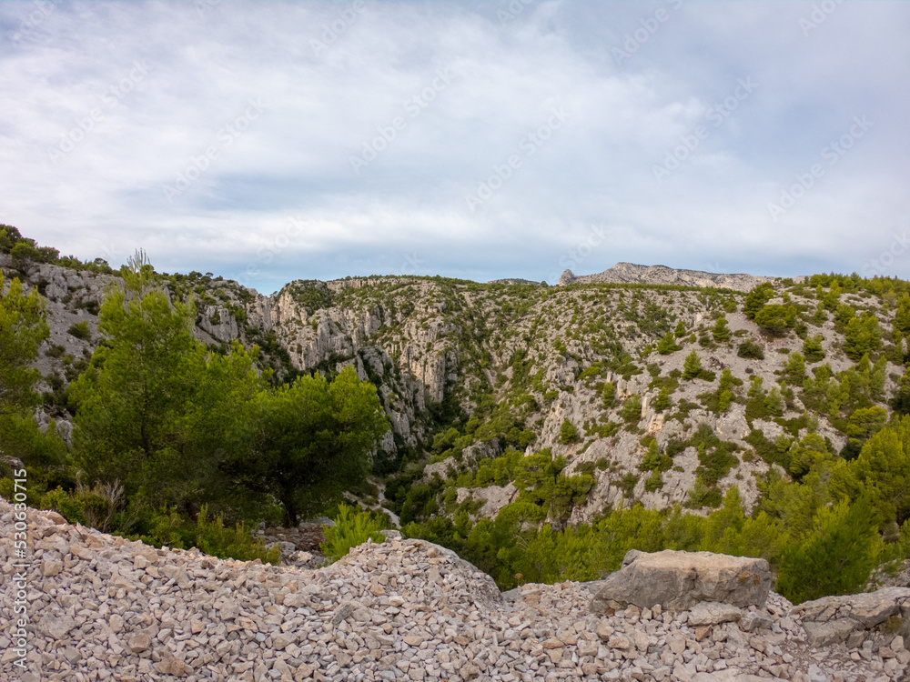 Rocky hiking path in mountain range Massif des Calanques near Cassis at the French Riviera, France. Walking trail near Calanque d'en vau.