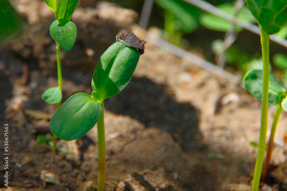 A small green sprout in black soil recently emerged from a sunflower seed.
