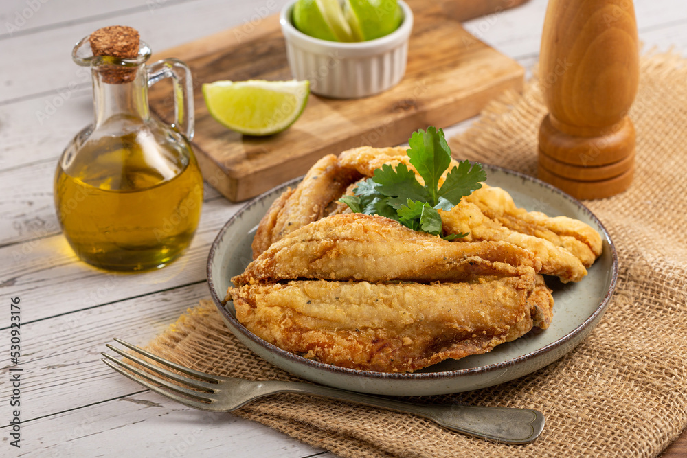 Fried sardines in the plate on the table.