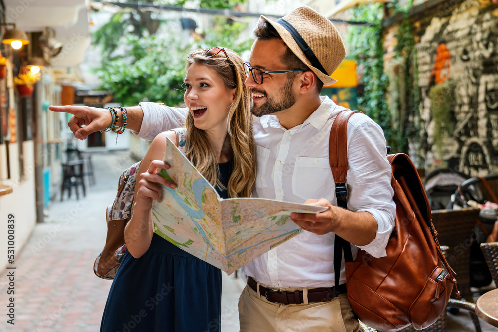 Young couple in love enjoying their honeymoon travel vacation. People happiness concept