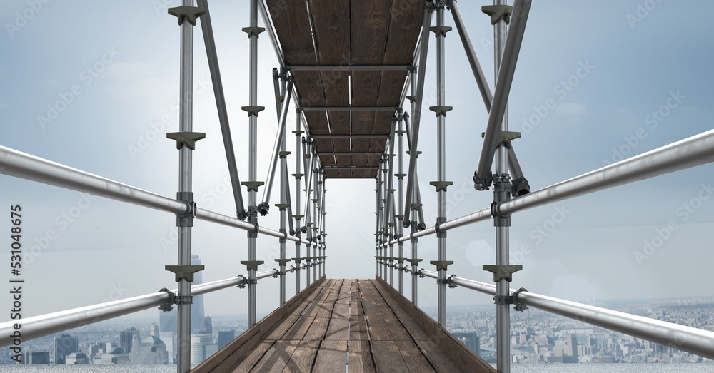 Construction scaffolding over a cityscape against clouds in the blue sky with copy space
