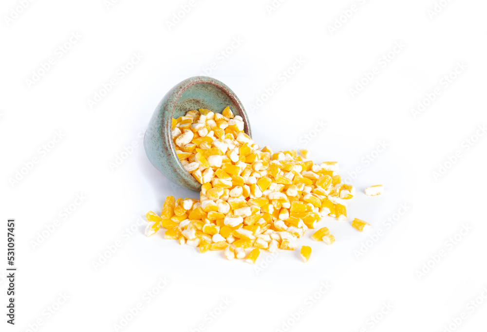 Yellow Hominy Corn Spills from Green Pottery Bowl Isolated on White