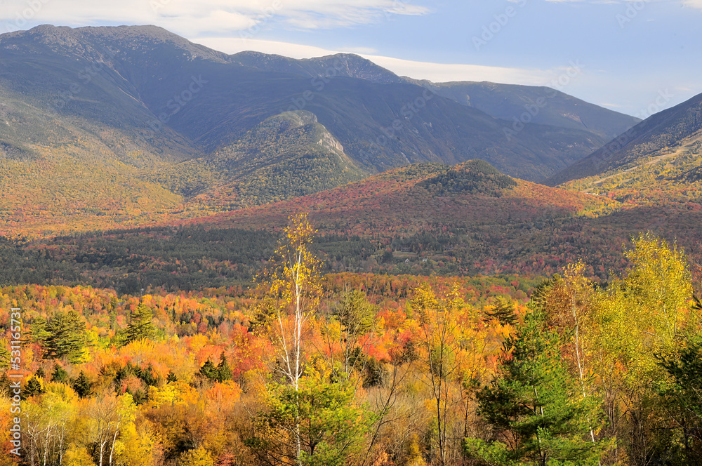 Autumn scene in White Mountain National Forest of New Hampshire. Scenic view from Sugar Hill of colorful fall foliage and tall peaks of Franconia Mountain Range.