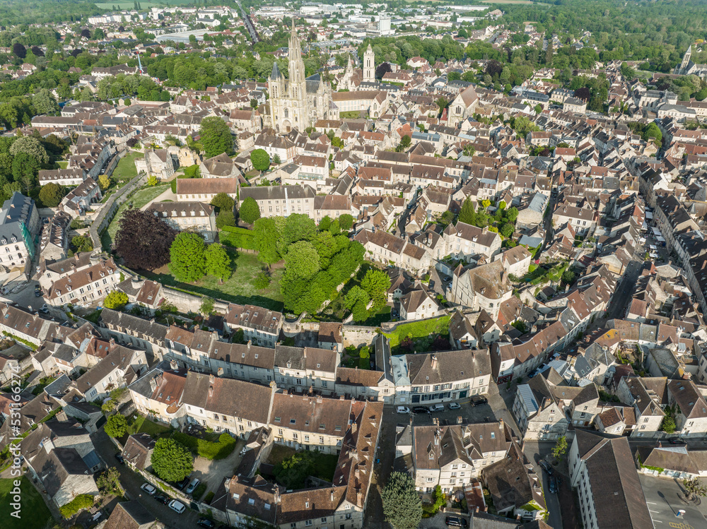 Aerial view of medieval town center of Senlis with Gothic cathedral and roman walls
