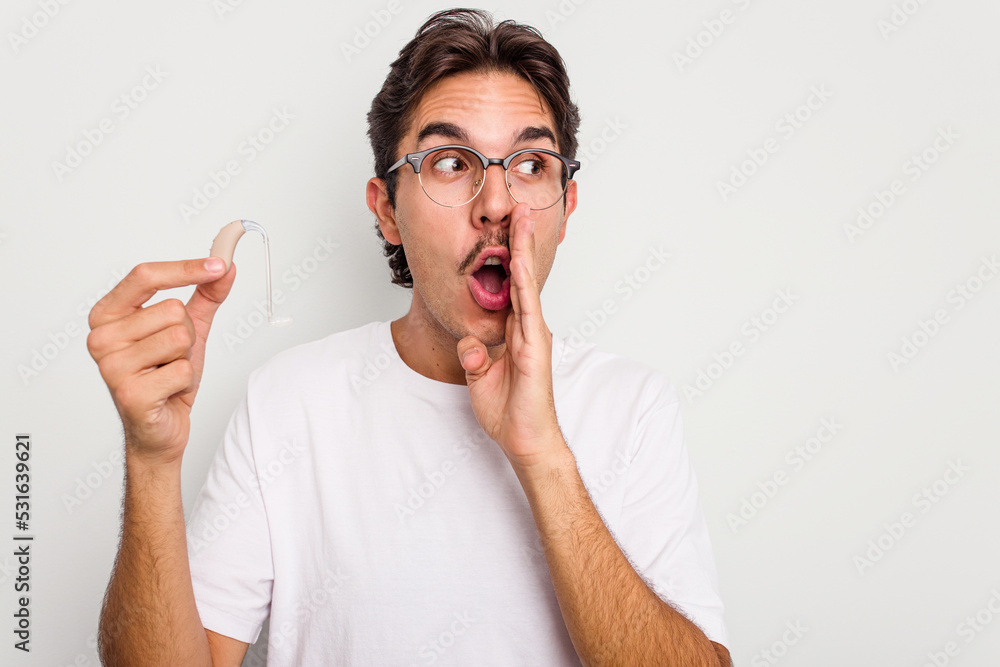 Young hispanic man holding hearing aid isolated on white background is saying a secret hot braking news and looking aside