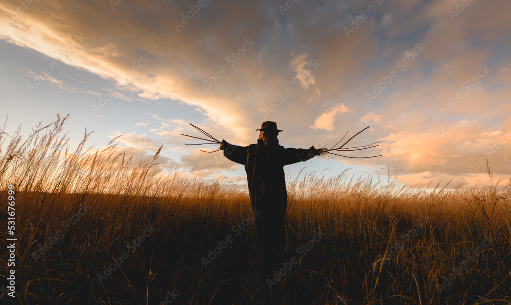 Scary scarecrow in a hat and coat on a evening autumn field during sunset. Spooky Halloween holiday concept. Halloweens background