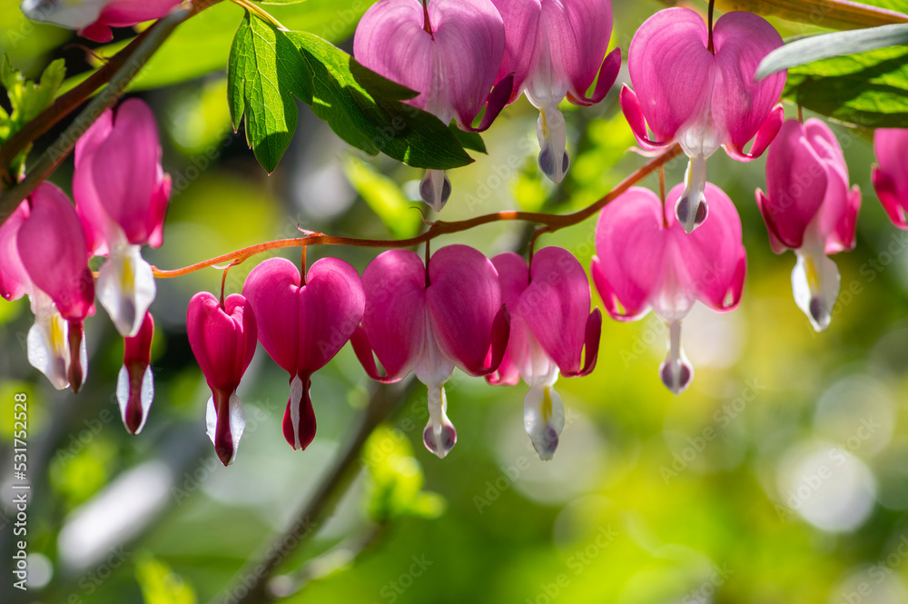 Dicentra spectabilis bleeding heart flowers in hearts shapes in bloom, beautiful Lamprocapnos pink white flowering plant