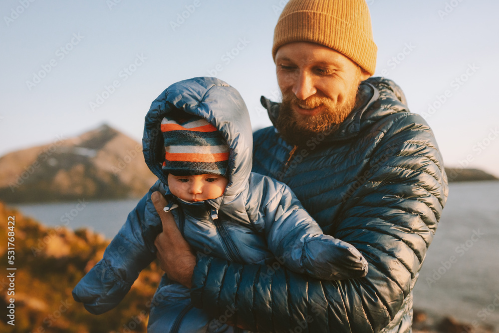 Father walking with baby outdoor family lifestyle travel together man with infant child wearing winter clothing
