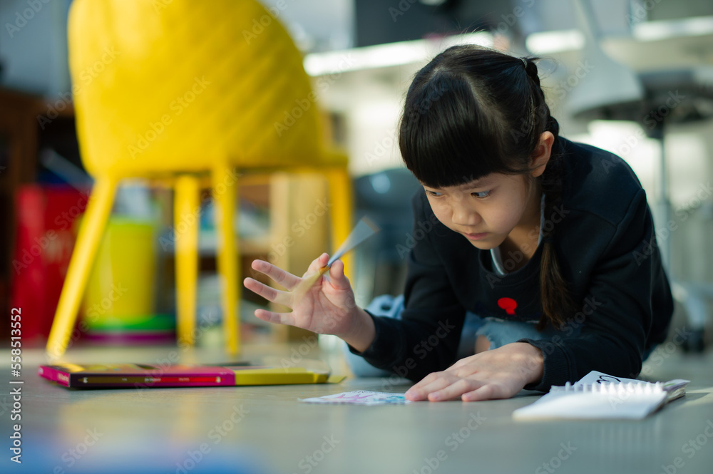 Beautiful lonely girl sits on the bedroom floor, holding a toy and looking out the big window.