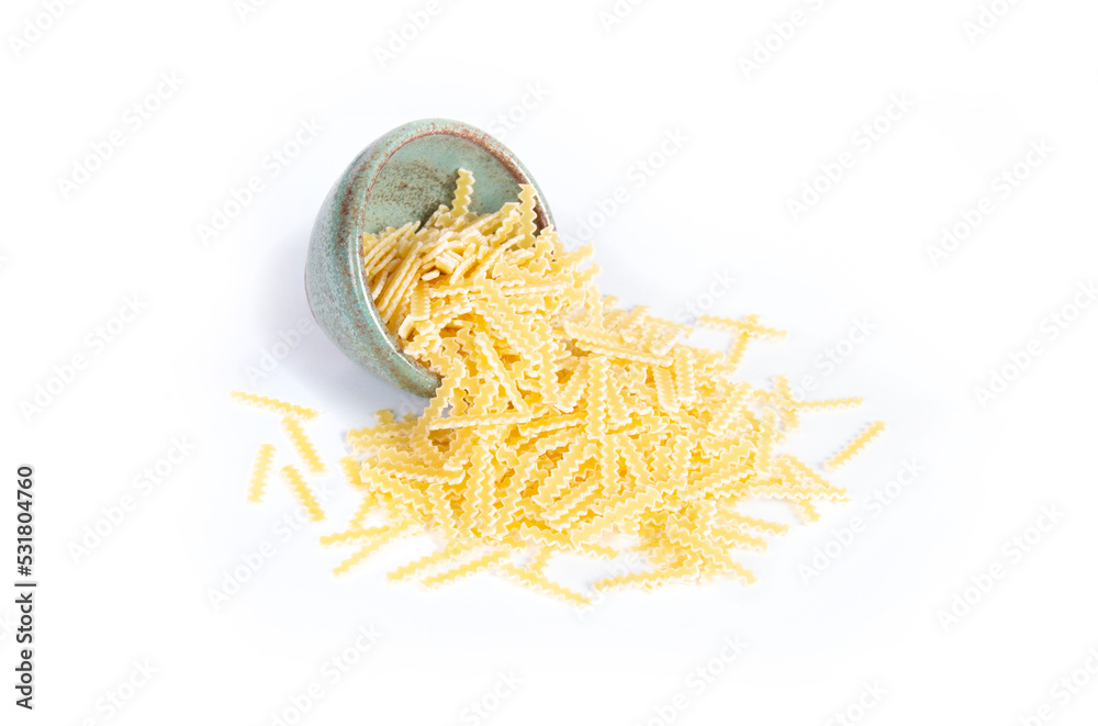 Csiga Hungarian Spiral Egg Noodles Spill From Green Pottery Bowl Isolated on White