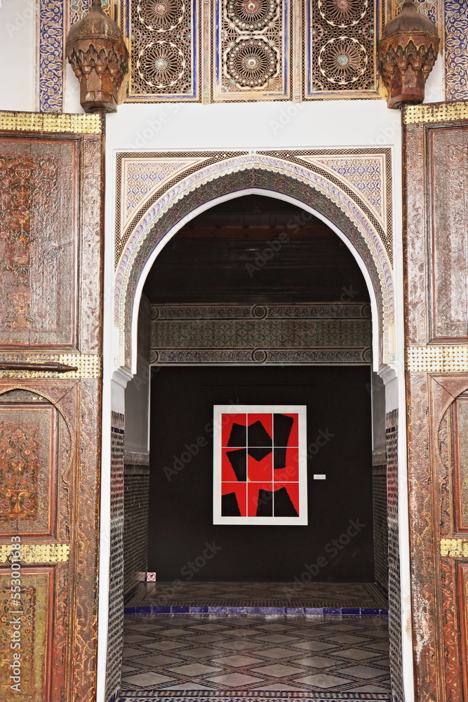 Portrait of a cool dachshund dog, wearing black and silver star-shaped glasses for a party, who sits on a yellow background, front view, copy space for advertising text
