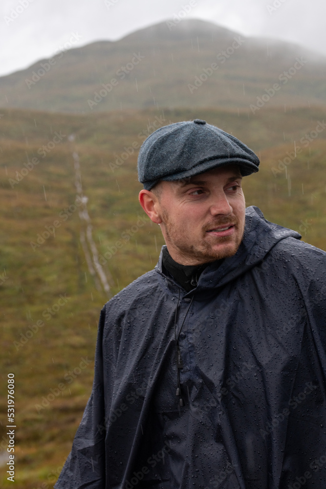 Hiker with a poncho and baret in the Scottish Highlands. raining. High quality photo