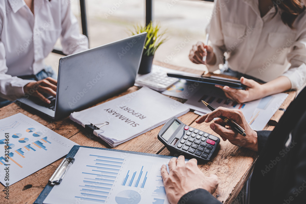 Young colleagues discussing business and price chart analyzes business people on the table great in modern coworking office teamwork concept. Calculate personal tax for customers