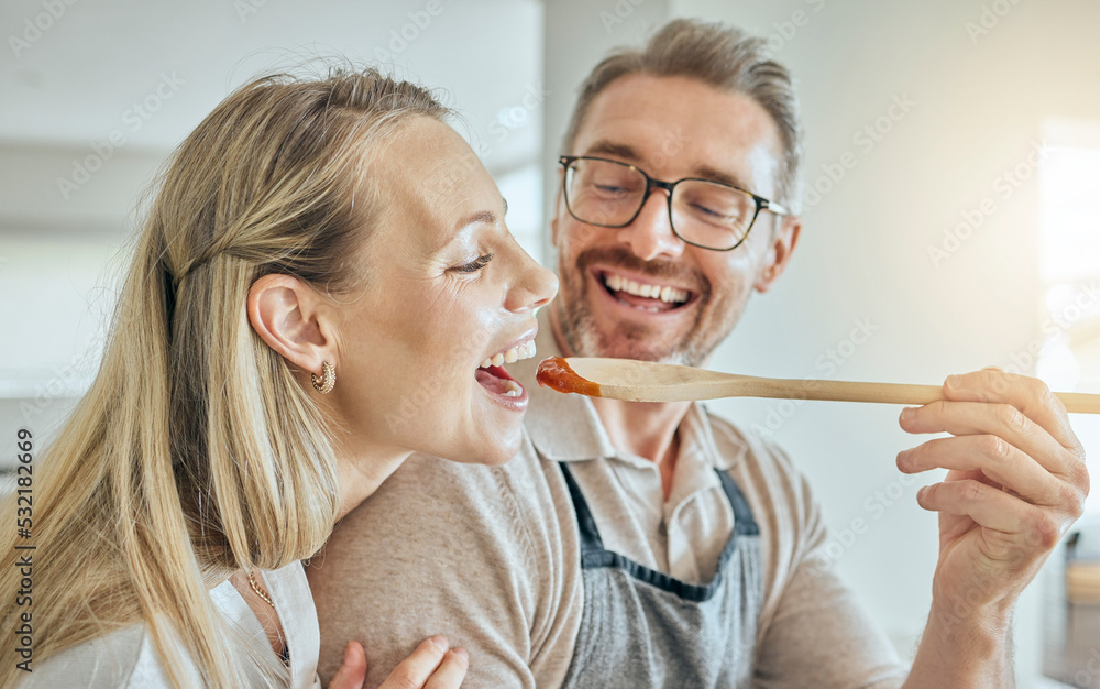 Happy couple cooking, tasting spoon of food and meal, lunch and dinner in kitchen at home. Smile mature man giving hungry woman a taste of homemade tomato sauce meal in mouth to enjoy eating together