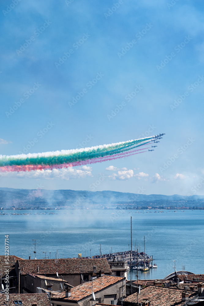 Tricolor arrows, the Italian aerobatic team, flying over Lake Garda