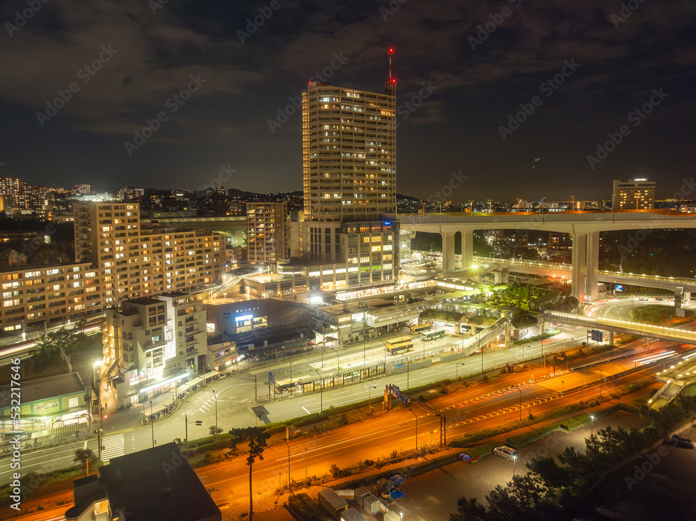 Tower rises above train station and roads in small city at night