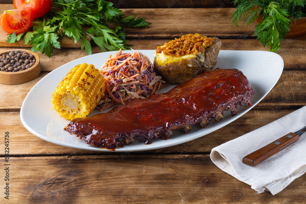 ribs grilled with BBQ sauce and caramelized in honey with baked potato, corn and coleslaw salad. Wooden background