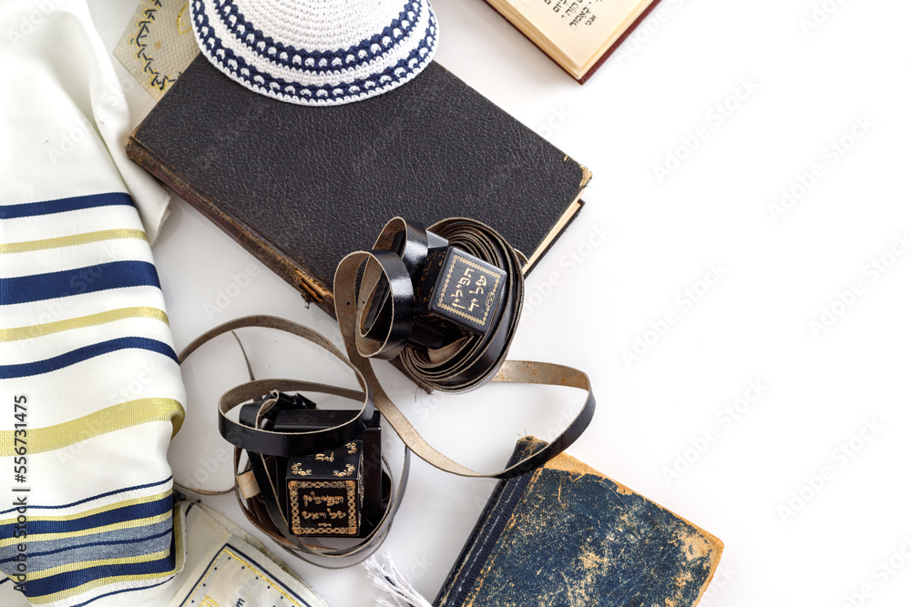 A small Torah scrolls A silver antique with a tour of the tablets of the covenant with the Hebrew letters. placed on a tallit