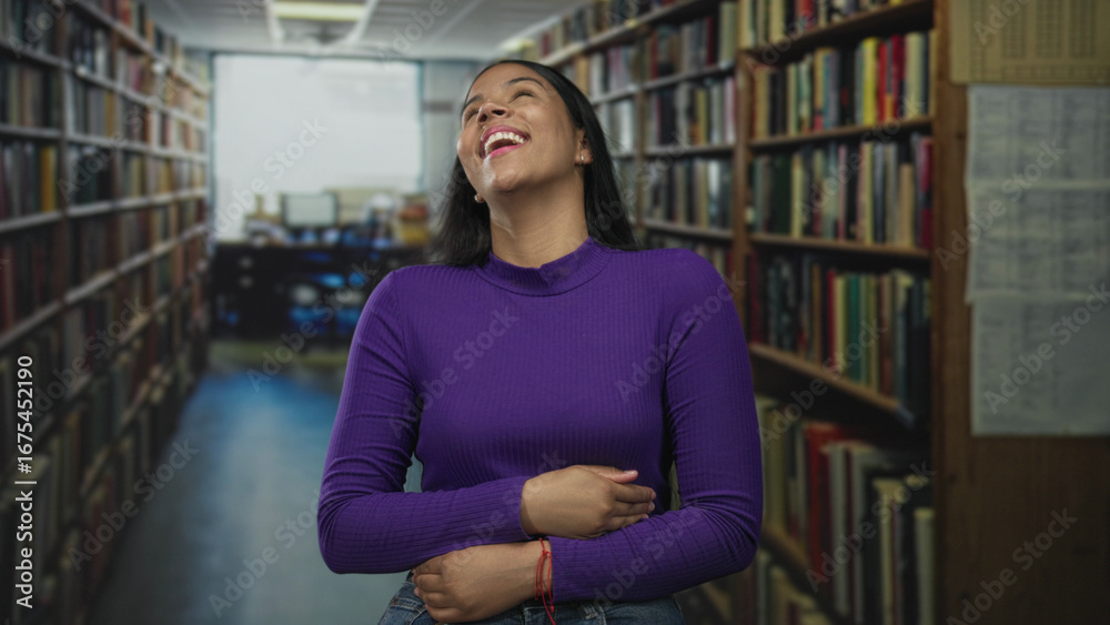 a young college student holding a pale of books on his head with a weary face, looking at laptop, learning from home concept