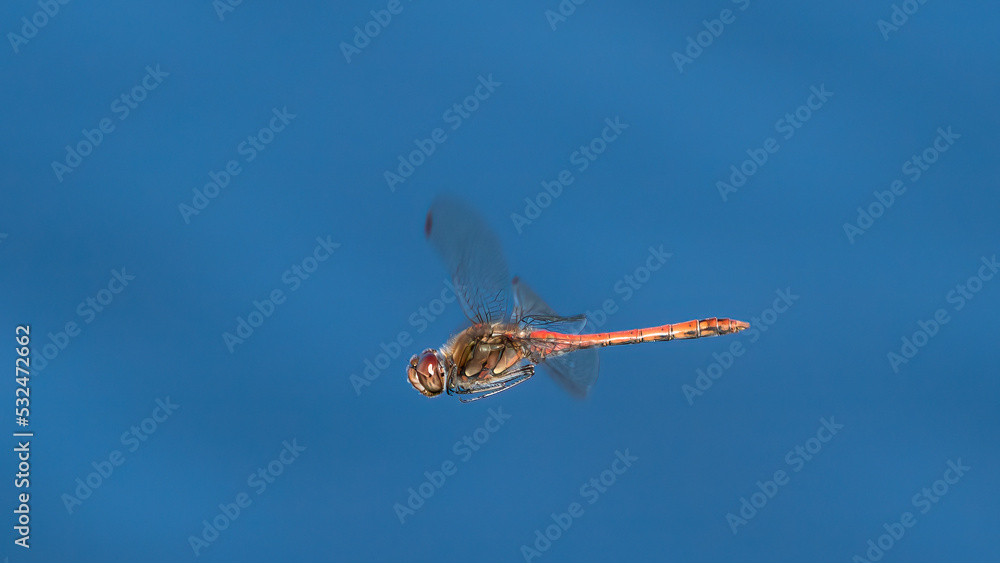 Close up of beautiful Vagrant Darter dragonfly male flying with blue background