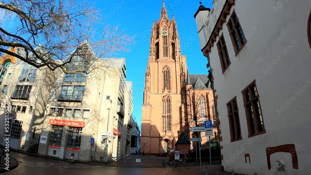 Frankfurt am Main, Germany, December 7, 2021: The tower of Frankfurt's Saint Bartholomeus's Cathedral (Kaiserdom St. Bartholomaus), a Roman Catholic Gothic church located in the city center.