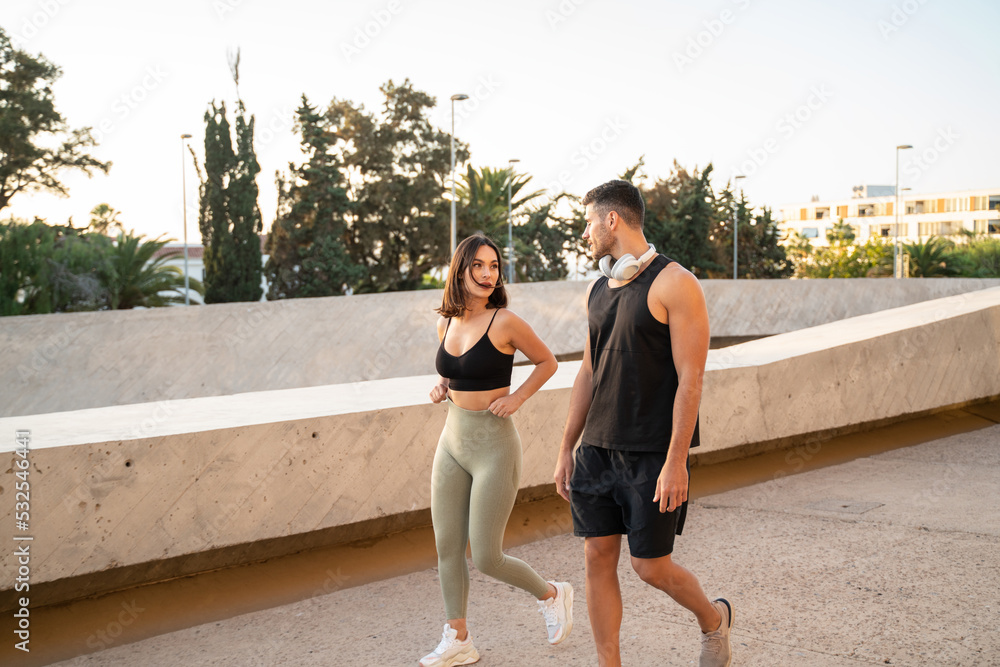 Fit sporty couple after morning run, walking and talking. Fitness, real healthy lifestyle concept.