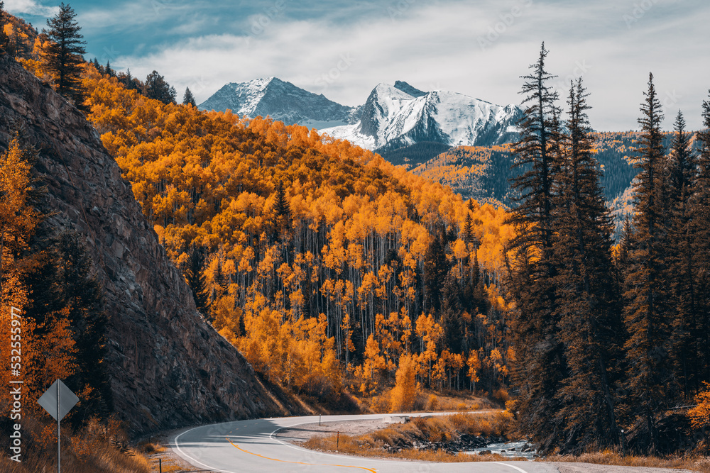 An asphalt road winds though the Colorado Rocky Mountains during fall with winter snow capped mountains in the background decorated by aspen trees in late Autumn.