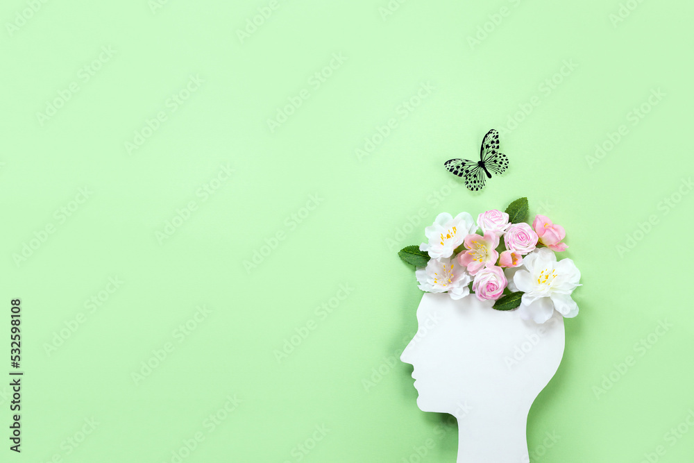 Cardboard silhouette of human head decorated with flowers and butterfly on green background. World mental health day concept. Copy space