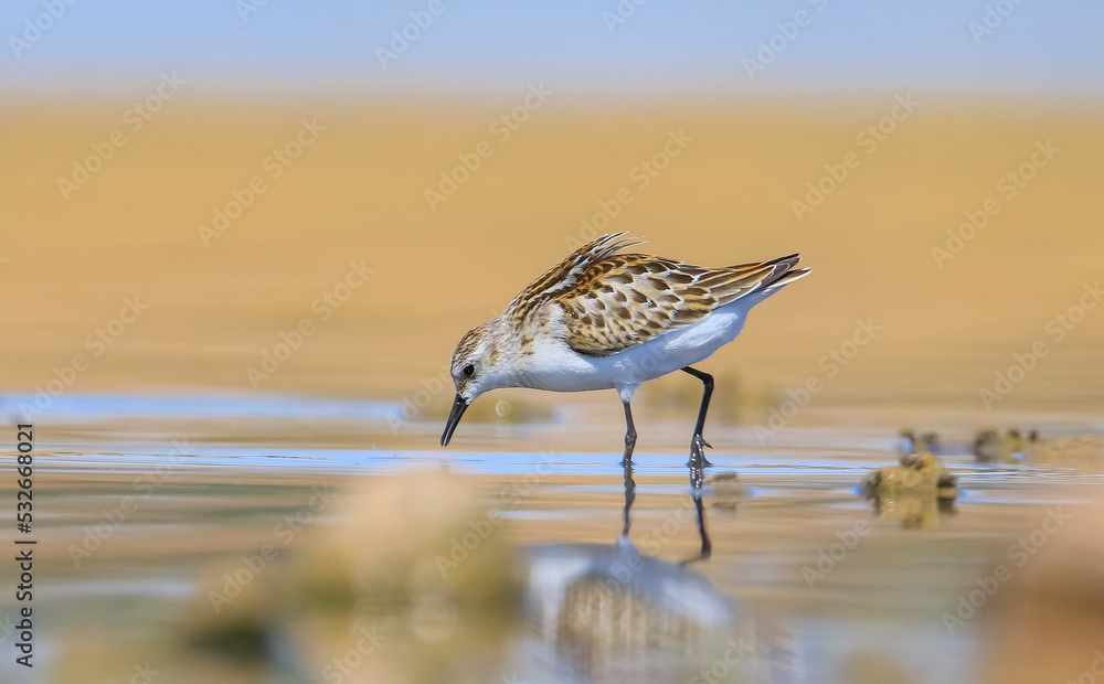 Little Stint (Calidris minuta) is is a wetland bird that lives in the northern parts of the European and Asian continents. It feeds in swampy areas.