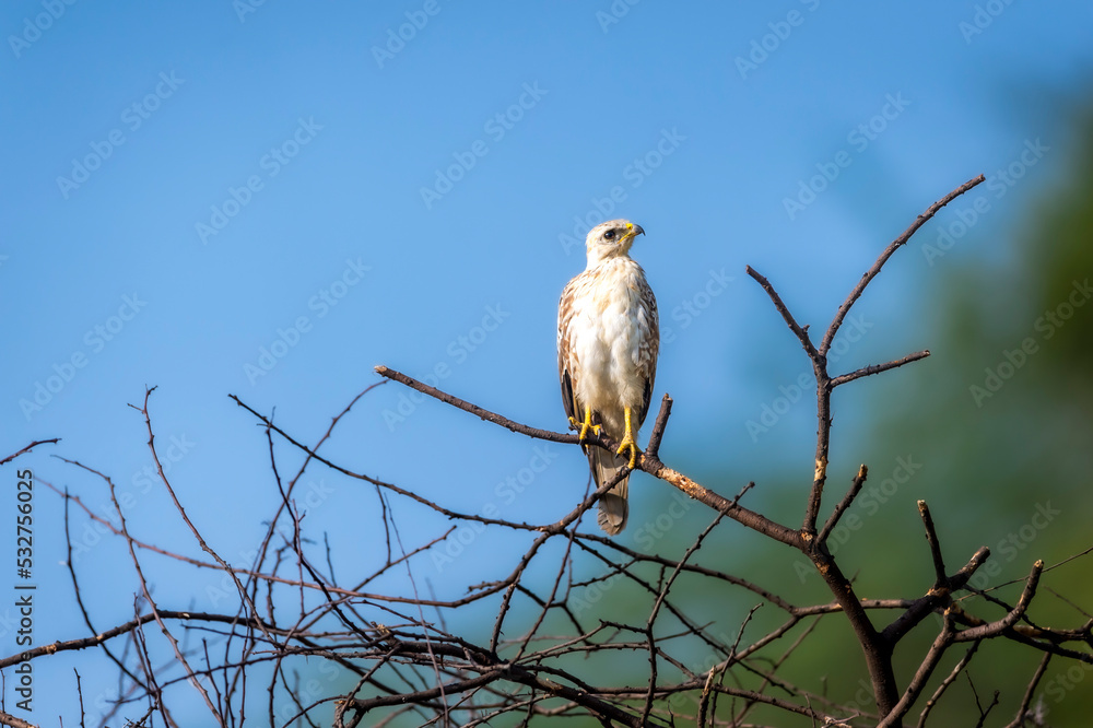 White eyed buzzard or Butastur teesa bird perched high on tree at jhalana forest or leopard reserve jaipur rajasthan india asia