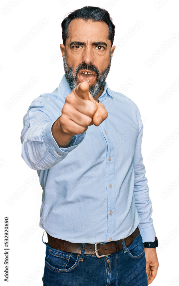 Middle aged man with beard wearing business shirt pointing displeased and frustrated to the camera, angry and furious with you